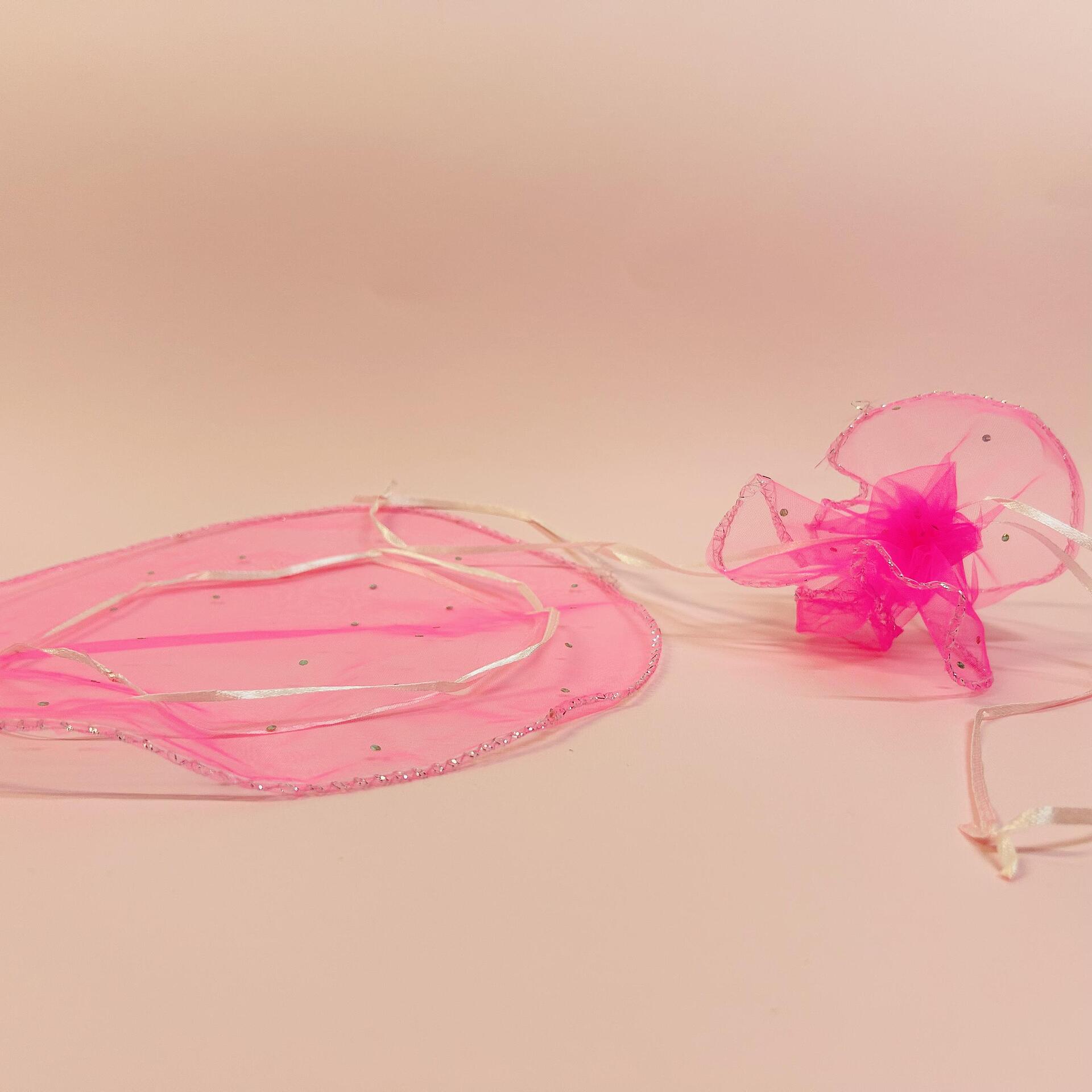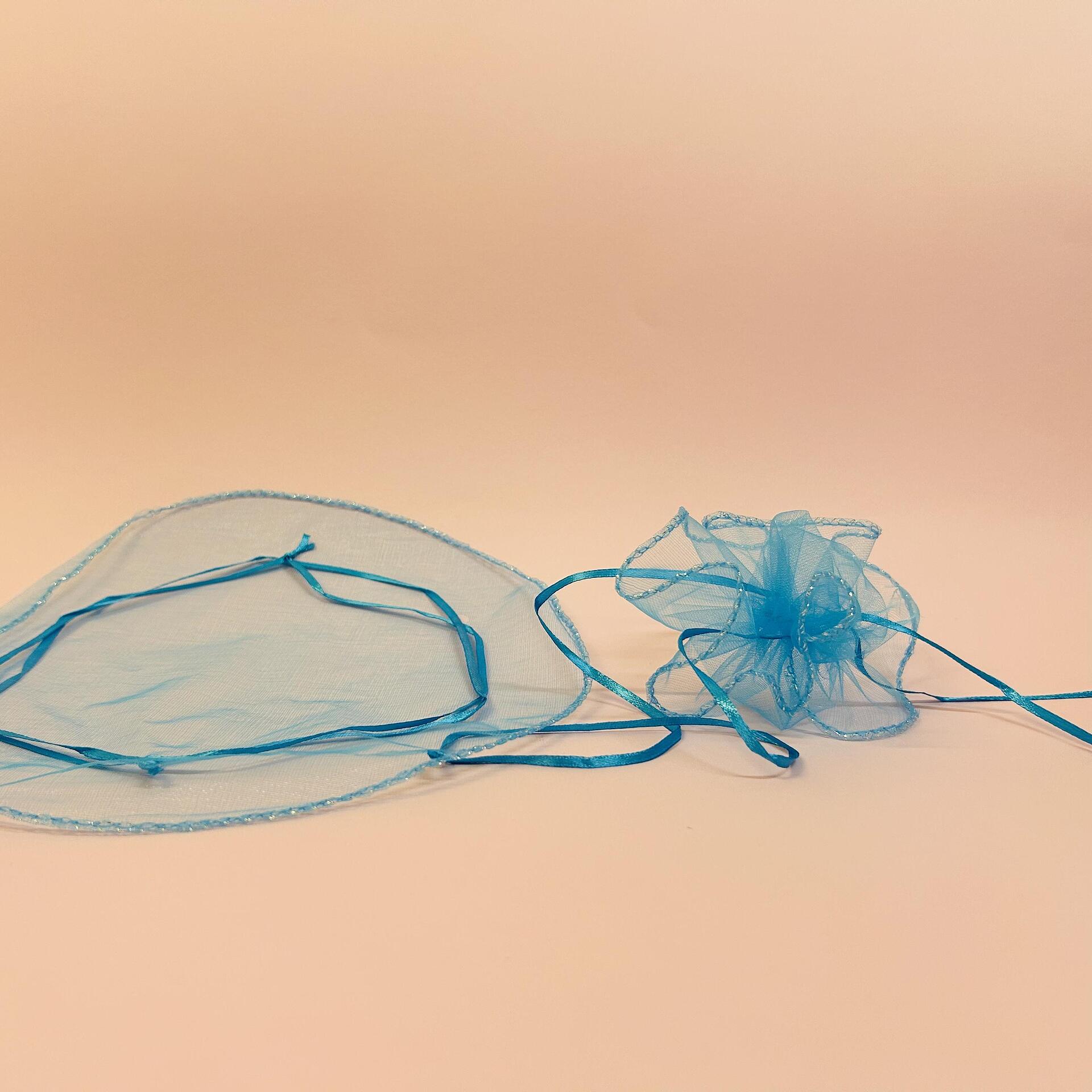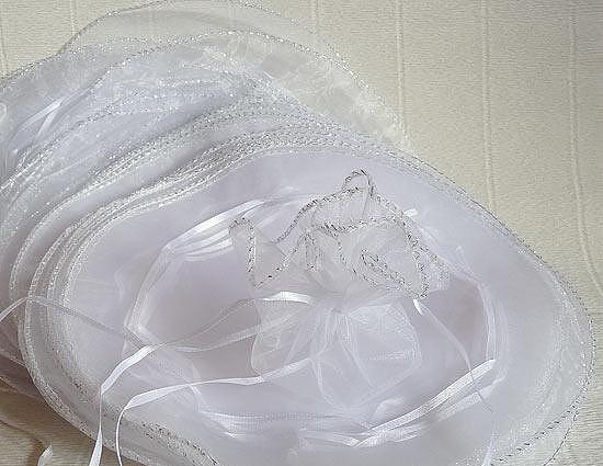 Кръгли, органзени торбичката със сатенирани връзки. В разтворено състояние са с диаметър 26 cm.