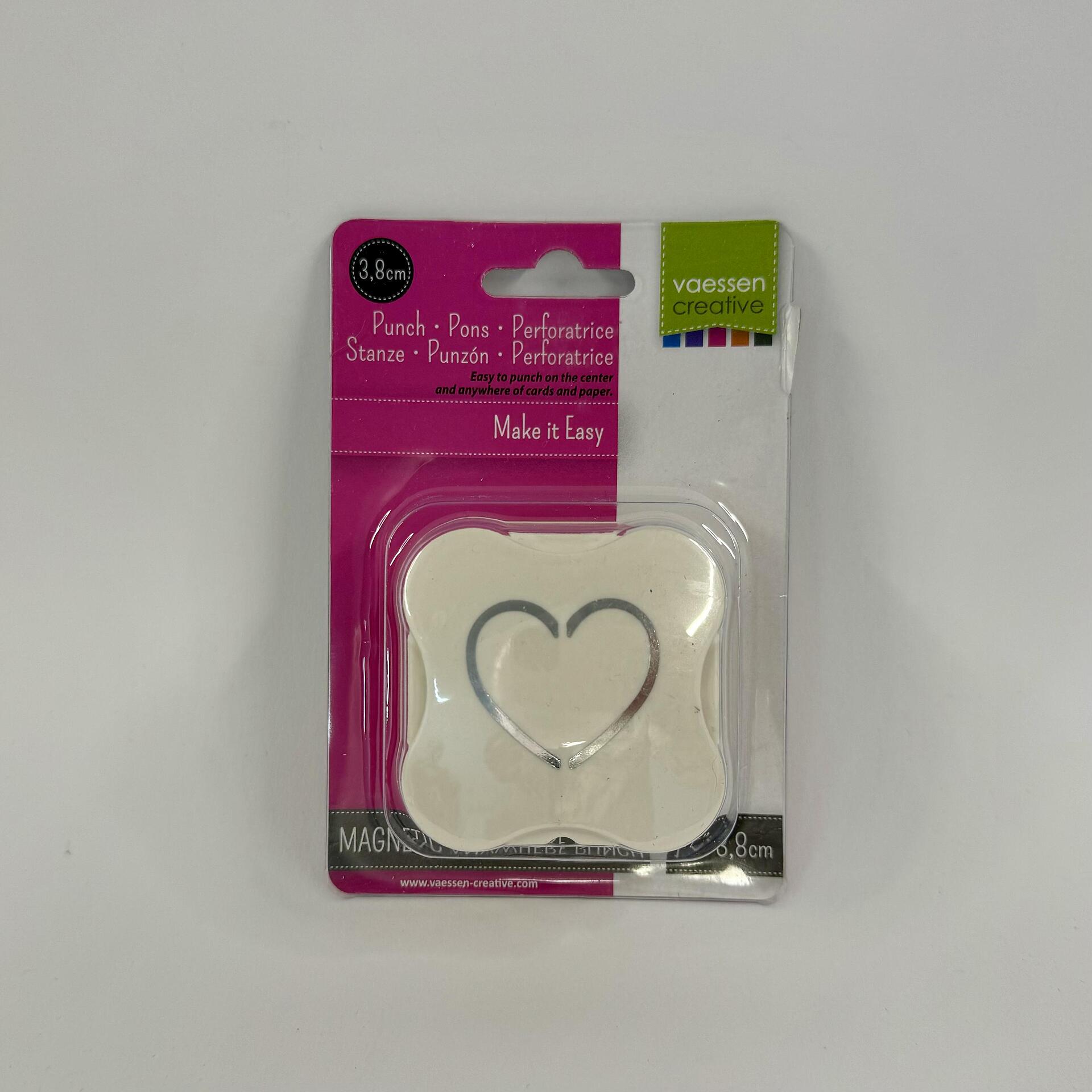 Магнитен пънч сърце 3D 3.8x3.8cm - прецизен пънч с магнитно задържане за точно позициониране преди изрязването. Изрязва красиви сърца 3.8x3.8cm от хартия и картон. Магнитният механизъм позволява повторение с перфектна точност. Vaessen Creative качество.